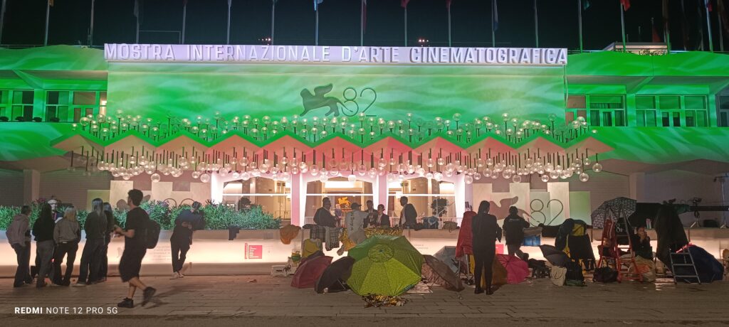 Mais Gaza n’était pas seulement présent dans la salle. Déjà avant l’ouverture de la Mostra, un collectif fondé par dix cinéastes italiens indépendants, Venice4Palestine, avait lancé un appel pour condamner la guerre menée par Israël dans la bande de Gaza, avec comme objectif « de mettre Gaza et la Palestine au centre de l’attention publique à Venise. » Exhortant le festival à adopter une position claire et sans ambiguïté, la lettre ouverte du collectif avait récolté 2000 signataires, parmi eux de grands noms du cinéma international comme Guillermo del Toro, Todd Field, Michael Moore, Matteo Garrone, Ken Loach, Abel Ferrara, Toni Servillo, Audrey Diwan ou Marco Bellocchio, pour n’en nommer que quelques-uns. Puis, le samedi 1ᵉʳ septembre, suite à l’appel d’associations de la région vénitienne, un cortège impressionnant de près de 3000 personnes, dont de nombreux artistes et accrédités, défilait de la gare maritime jusqu’aux abords du festival sous les drapeaux palestiniens, réclamant l’arrêt du génocide,